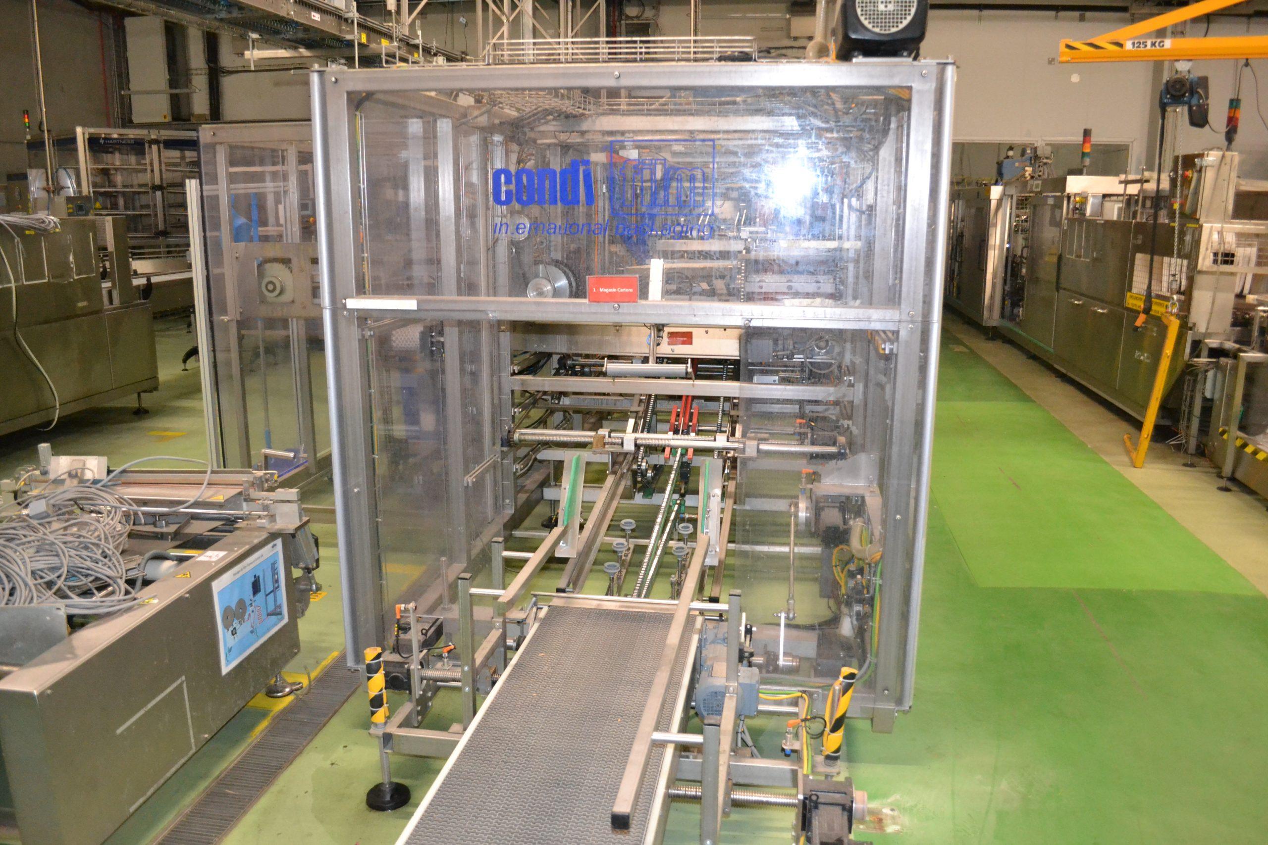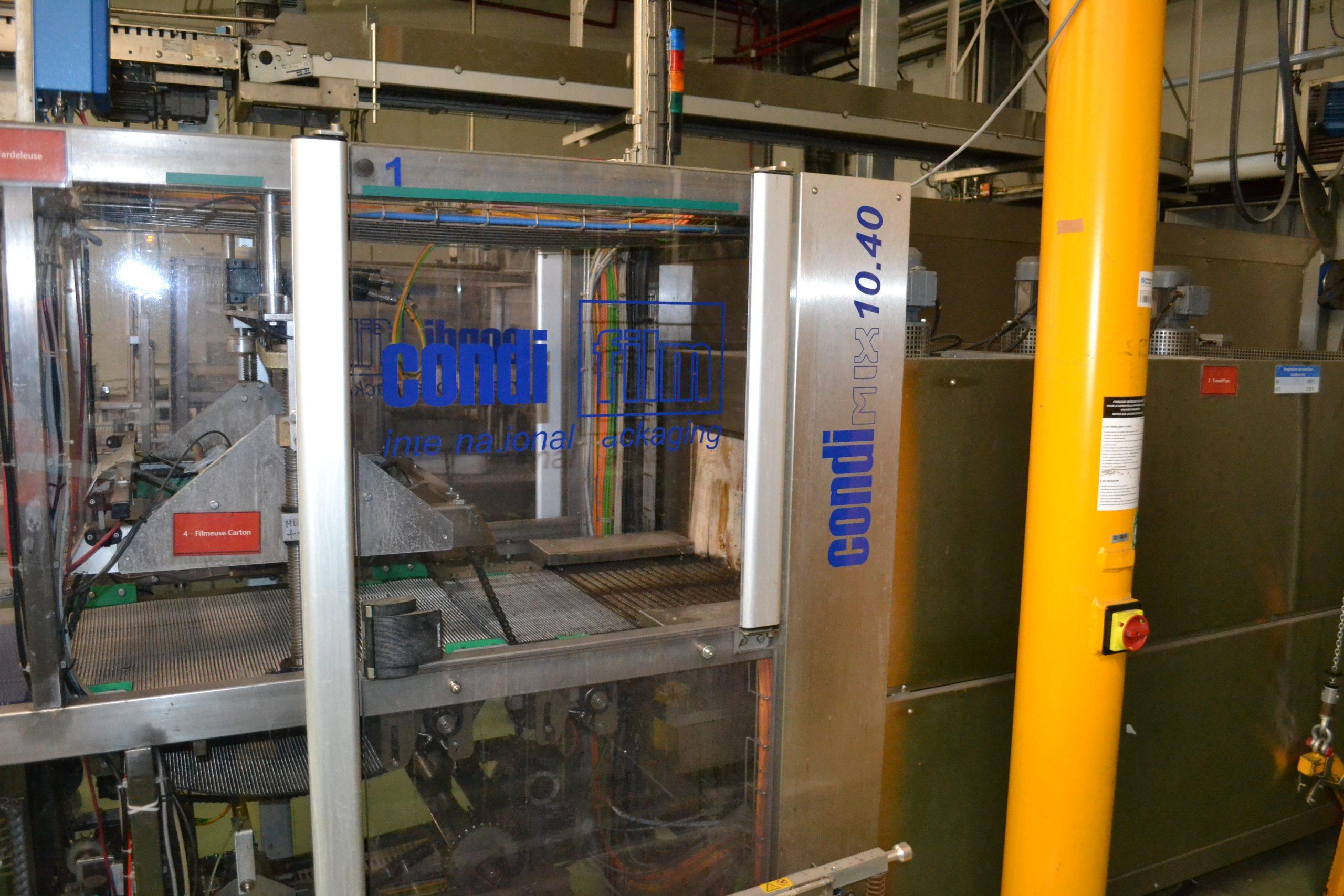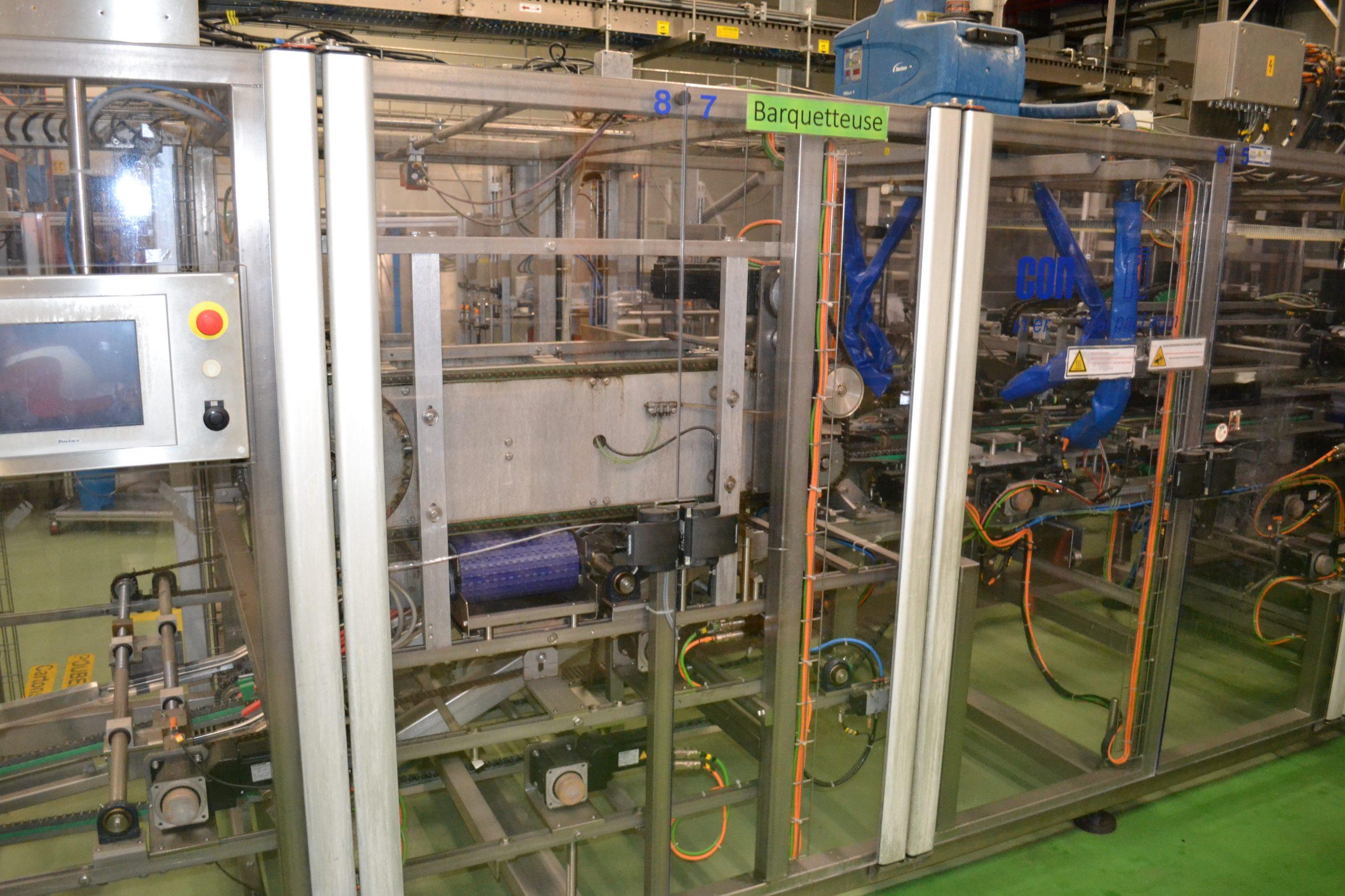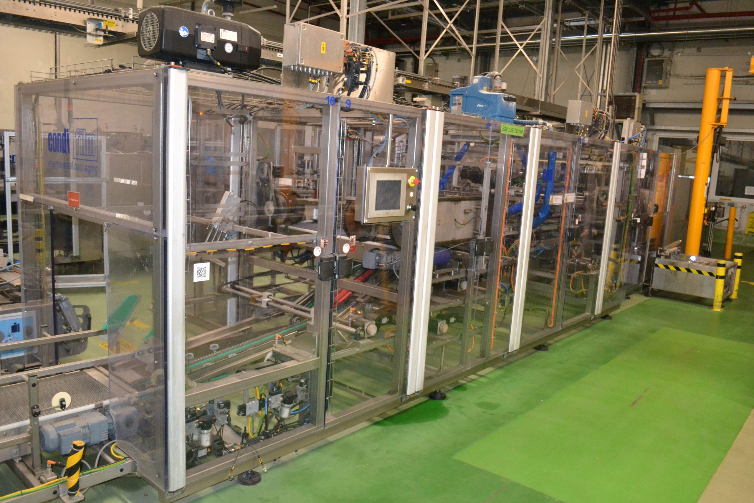 Ligne de production (2014) d'une capacité de 8000 unités / h composée d'un accumulateur de la marque HARTNESS international modèle DYNAC 6800 année 2014 N° de série W680219H83 et d'une barquetteuse CONDIFILM et d'une filmeuse CONDIFILM condimix 10,40
