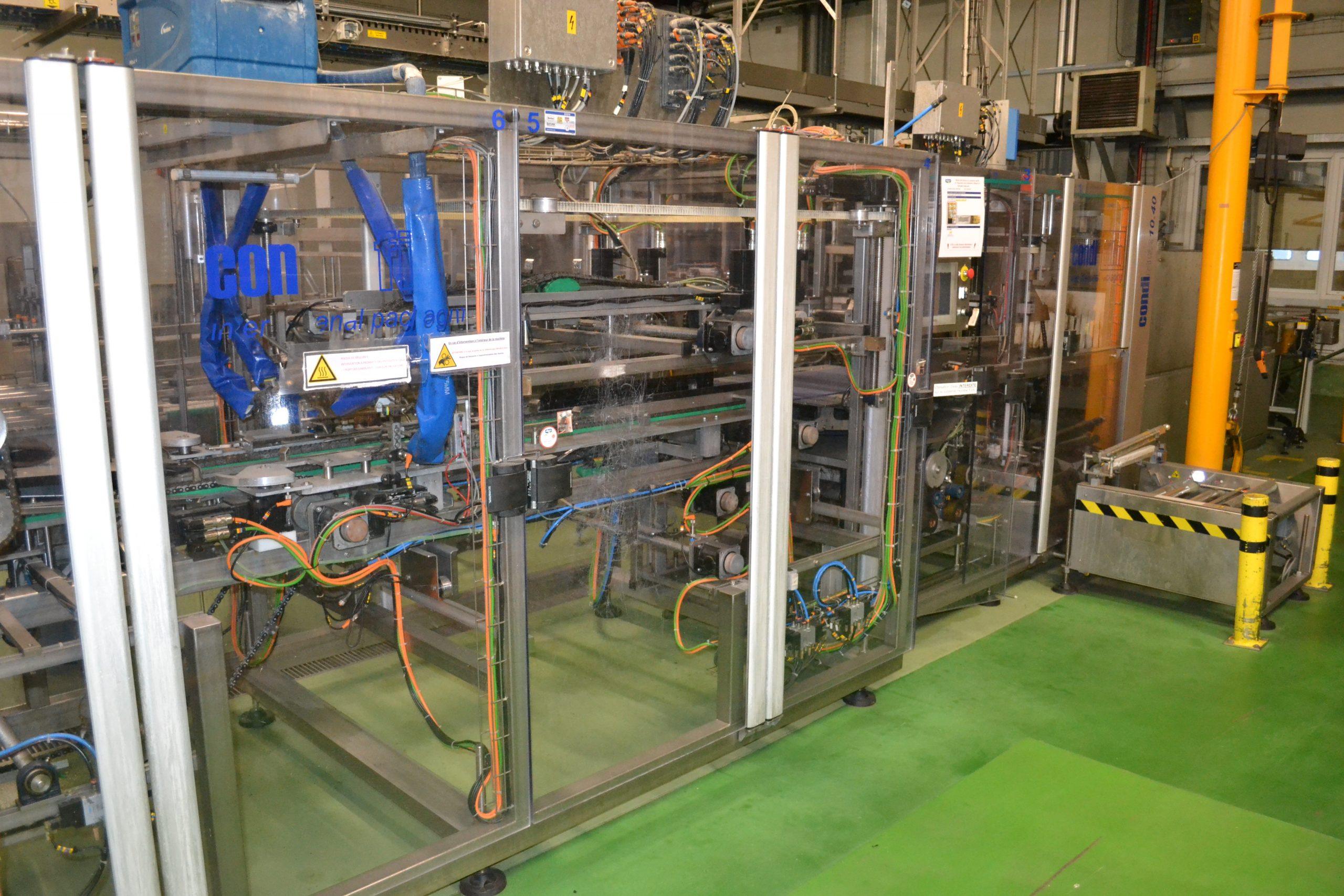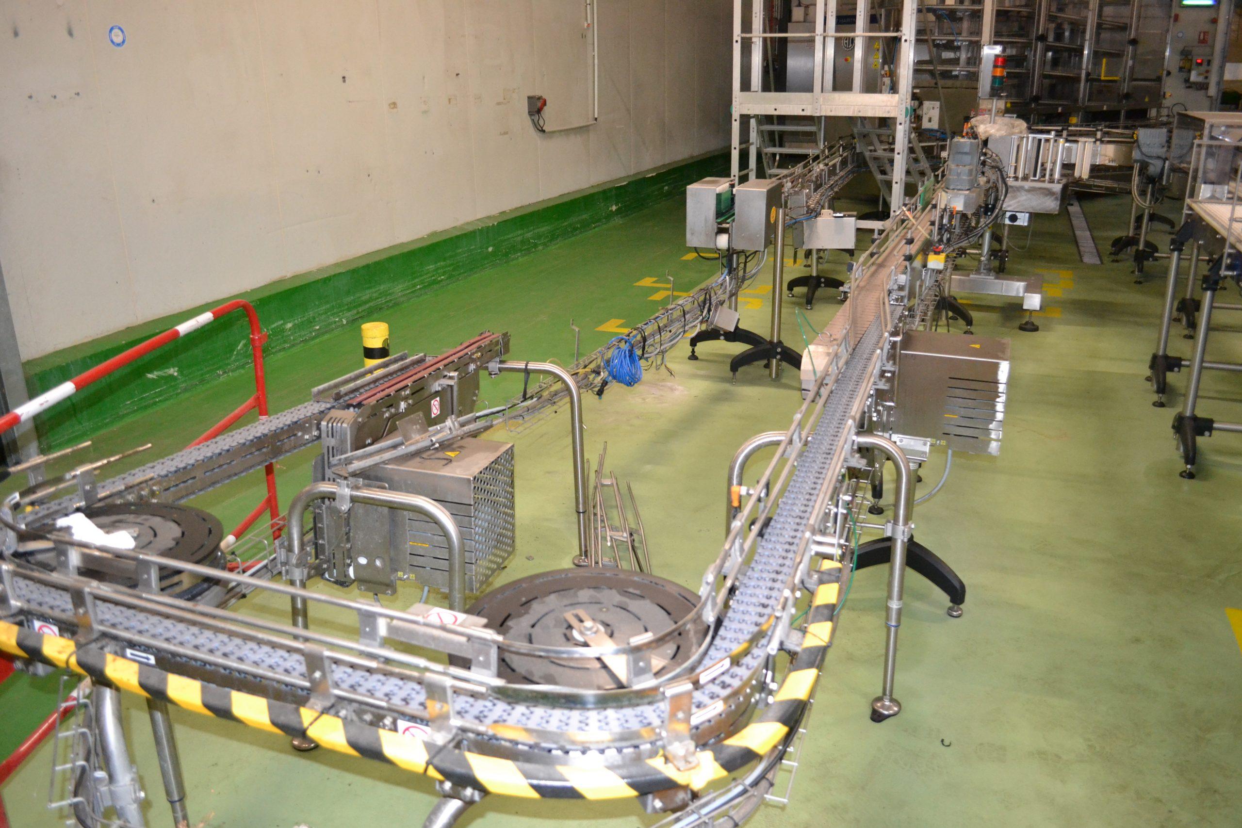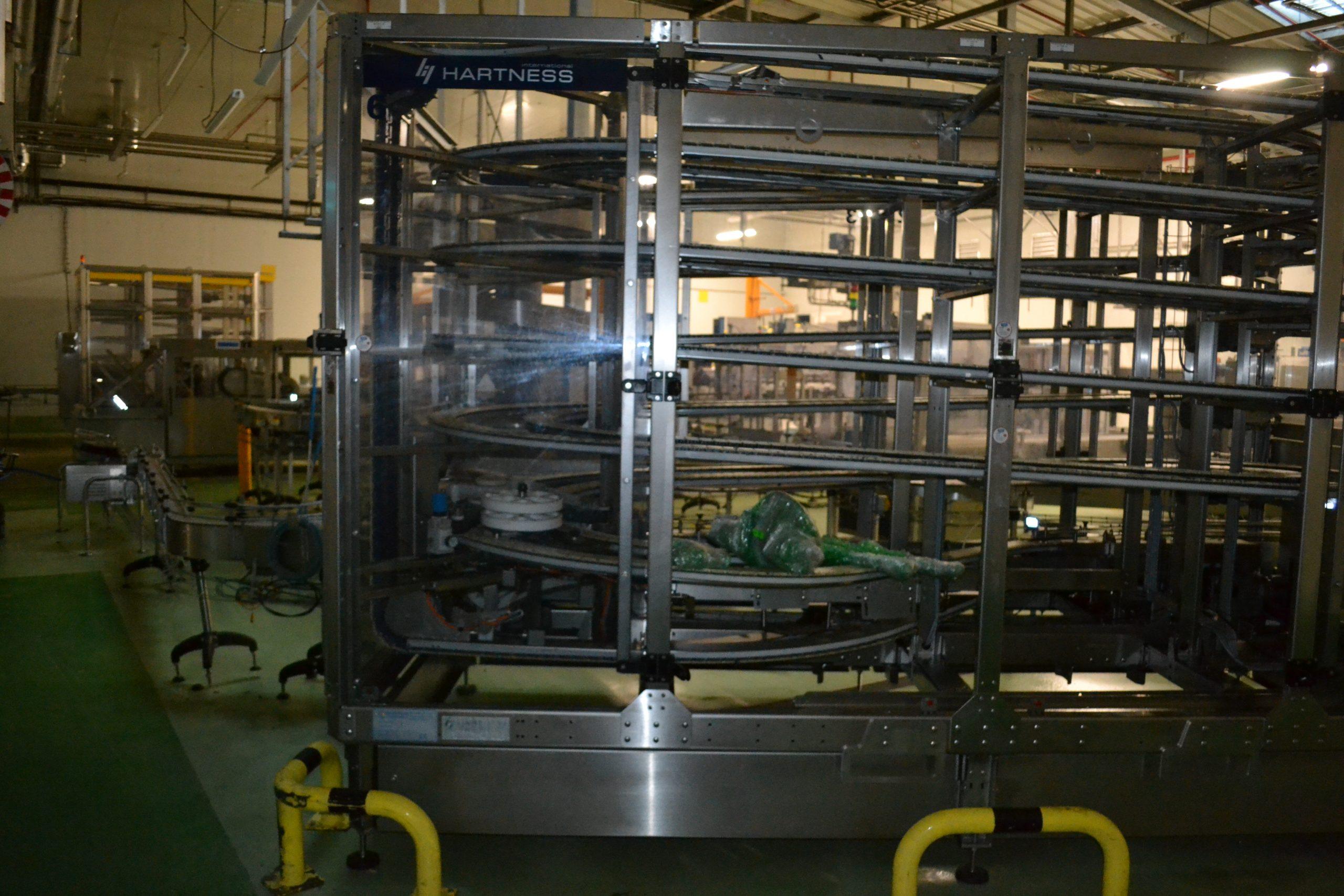 Ligne de production (2014) d'une capacité de 8000 unités / h composée d'un accumulateur de la marque HARTNESS international modèle DYNAC 6800 année 2014 N° de série W680219H83 et d'une barquetteuse CONDIFILM et d'une filmeuse CONDIFILM condimix 10,40